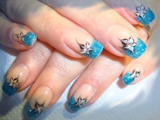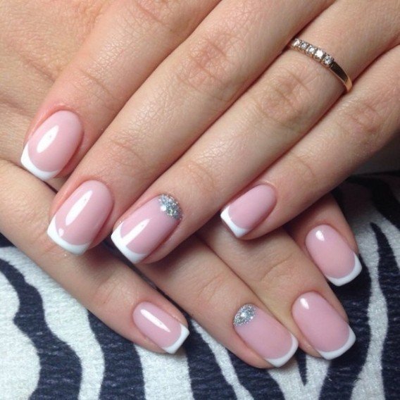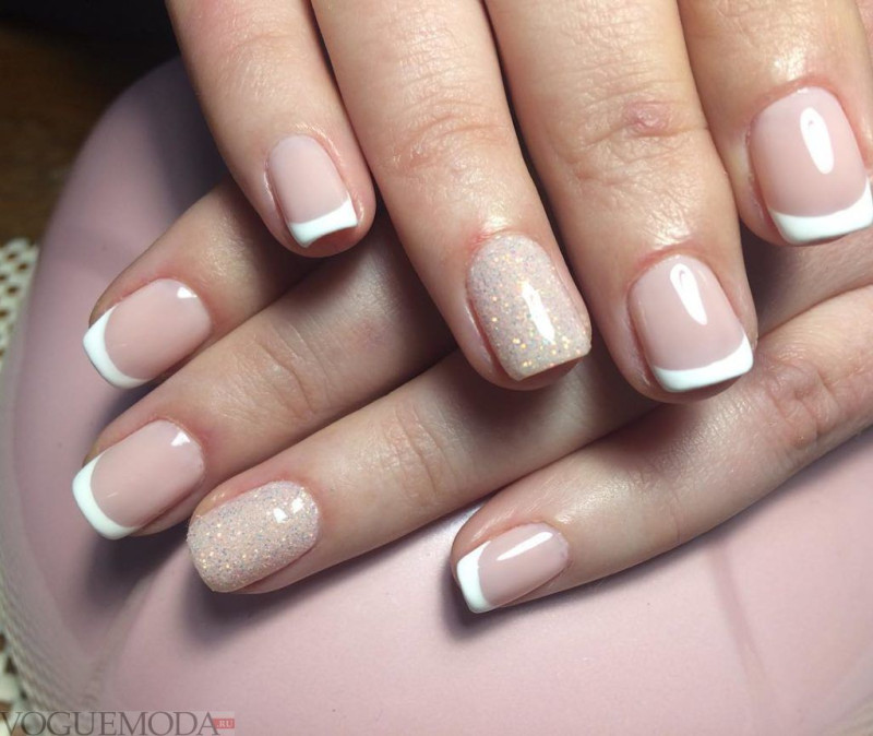 Многие девушки отдают предпочтения блесткам на ногтях. Если нанести глиттер не на всю поверхность пластины, а только на ее кончик, получится отличная идея для френча.