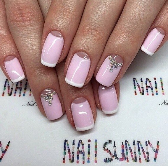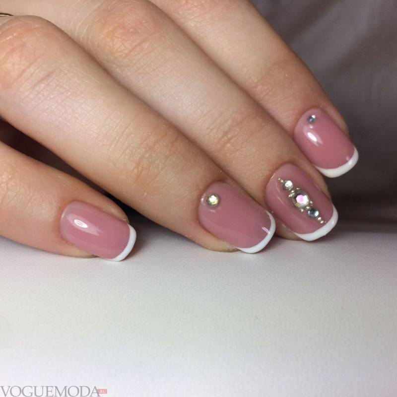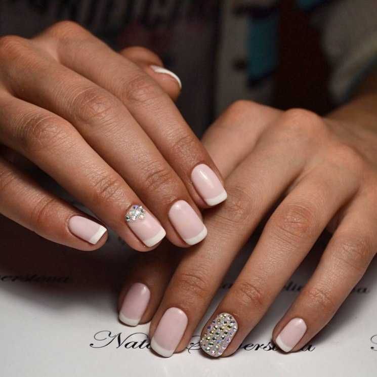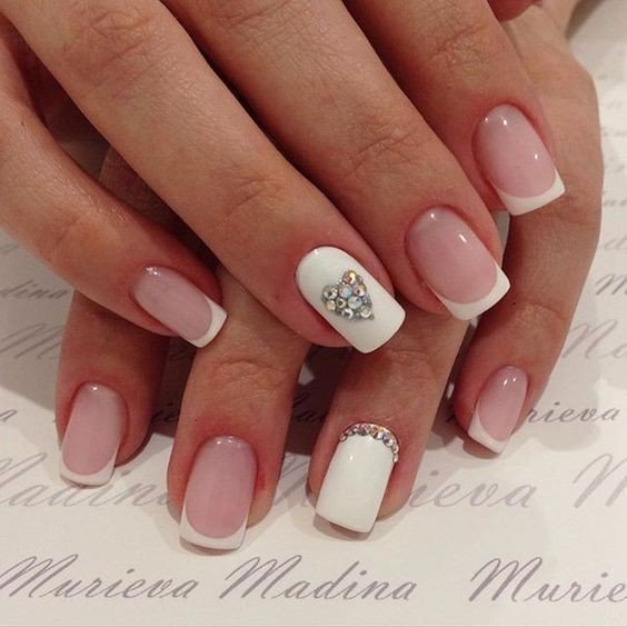 Особенно, любят френч невесты. Он превосходно сочетается со свадебным платьем, а помочь подчеркнуть торжественность образа помогают стразы и кружевные мотивы.