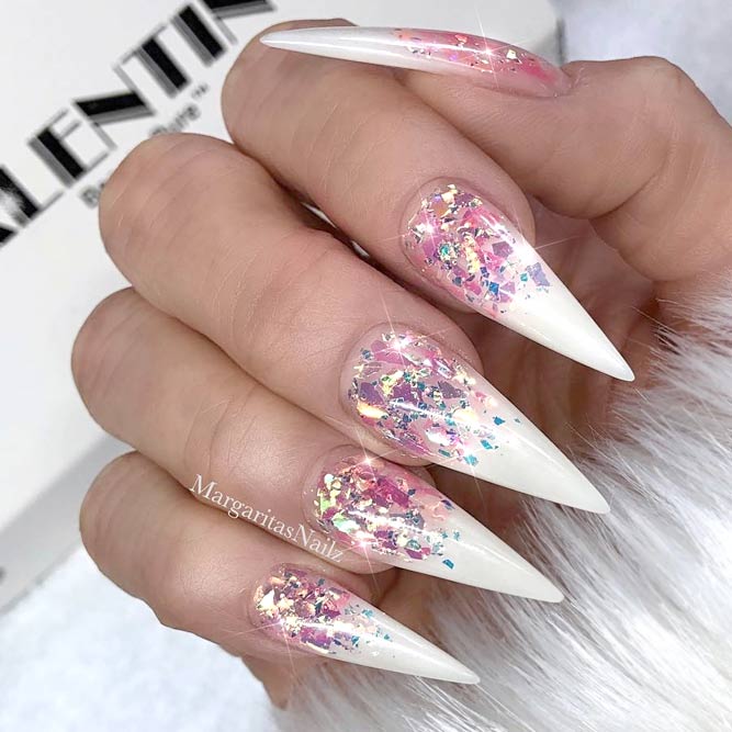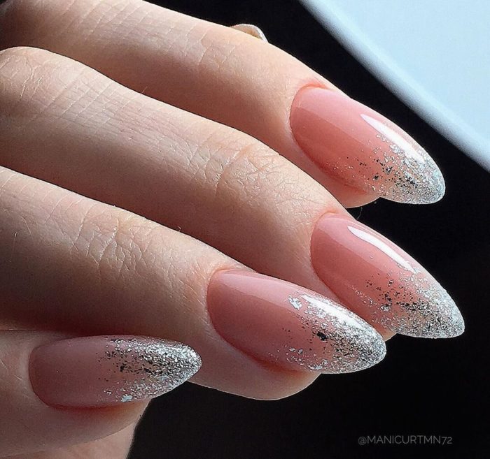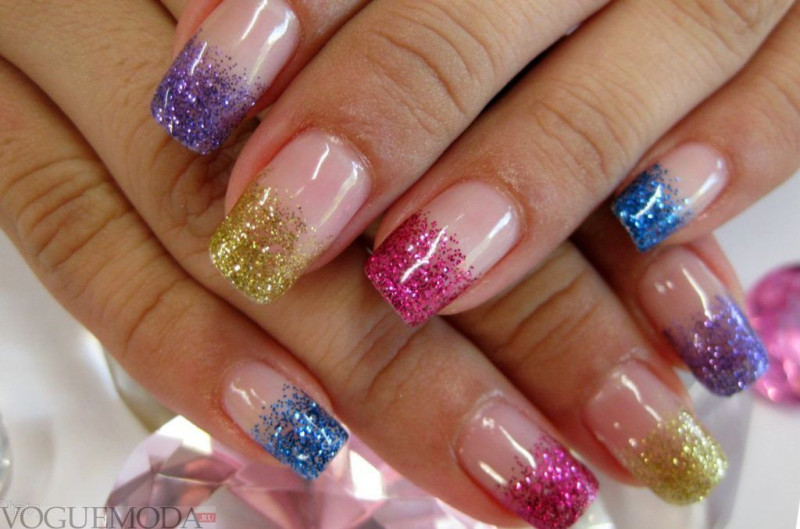 Очень красиво смотрятся блестки серебристых и золотистых оттенков. Такой дизайн станет беспроигрышным вариантом для любого торжества. Если же хочется сделать максимальный акцент на ногтях, можно использовать цветные глиттеры всех цветов радуги. Кстати, сама ногтевая пластина также не обязана быть прозрачной. Варьируя сочетания цветов и оттенков можно получить весьма необычный эффект.