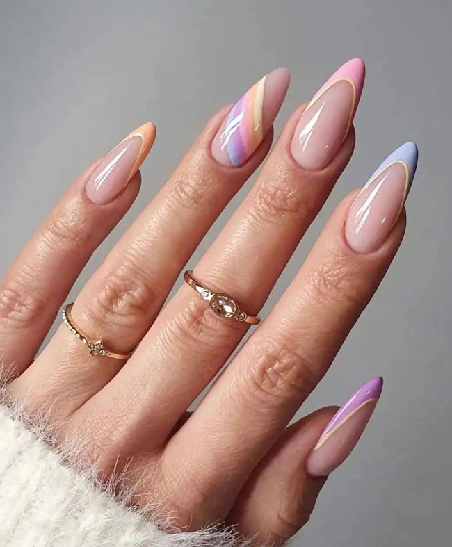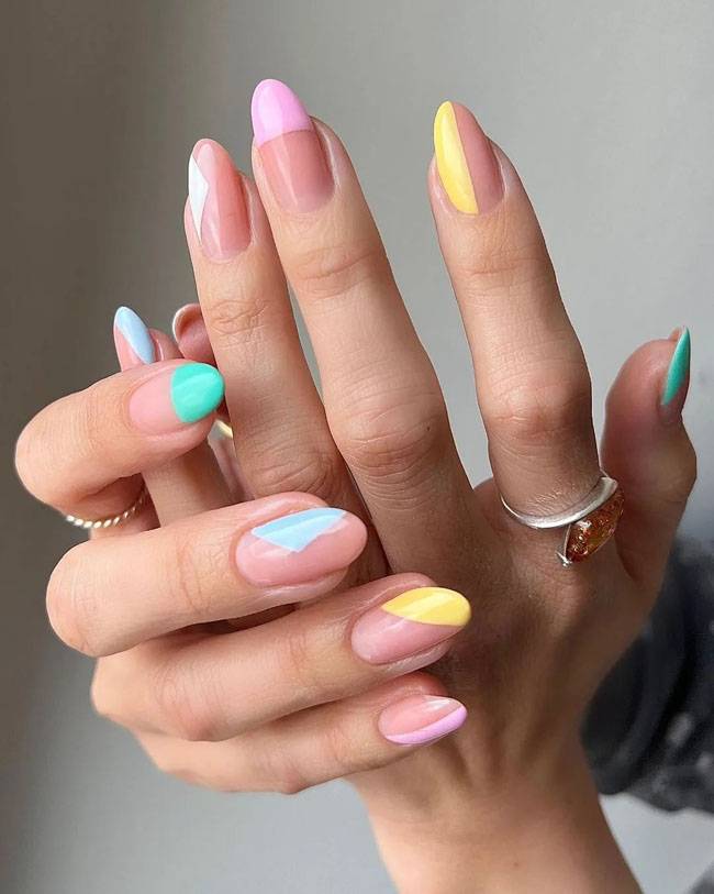 Пастельные тона тоже остаются с нами летом. Они идеально сочетаются с загорелой кожей. Это пастельно розовый, синий, желтый, персиковый, мятно-зеленый или сиреневый.