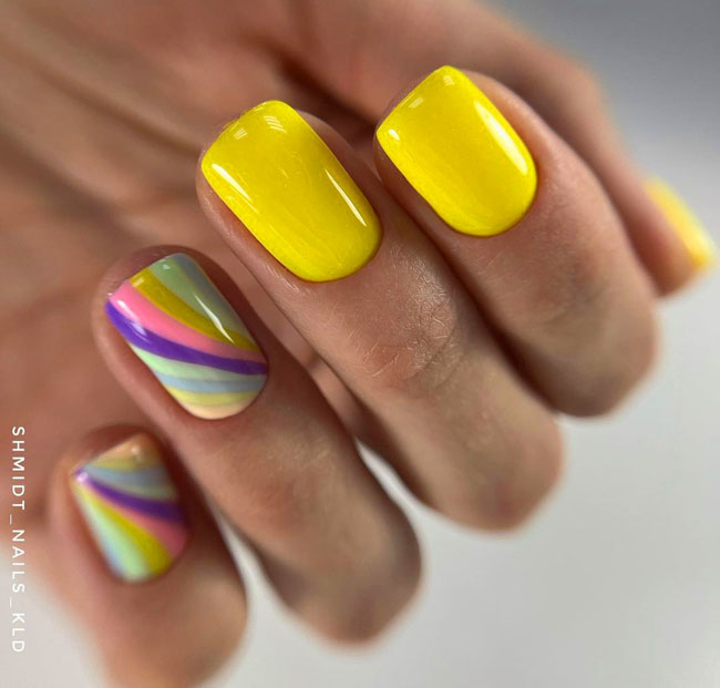 - Один из самых ярких и жизнерадостных летних цветов — желтый. Каждый летний сезон невозможен без желтого лака. В 2024 году в моде более пастельный оттенок желтого.