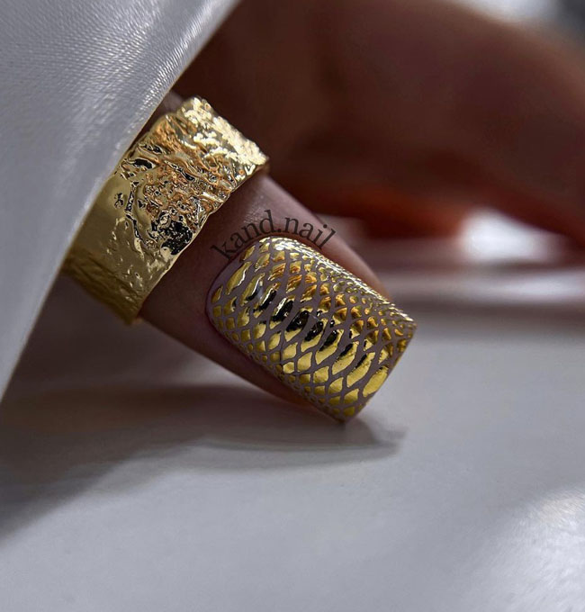- Текстурированные ногти также в тренде — с использованием сусального золота, блестящих текстур или матовой отделки. Можем использовать камни или другие украшения для достижения 3D-эффекта.