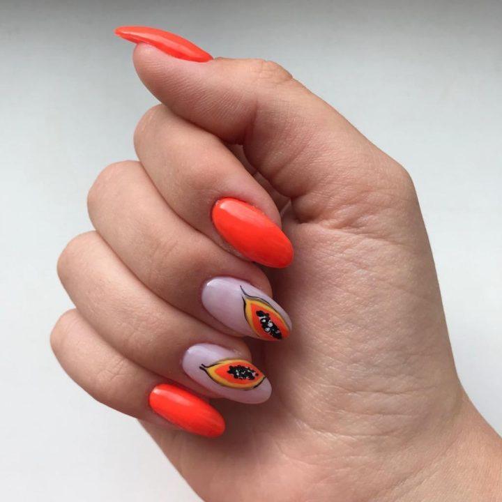 Вкусный маникюр лето может быть выполнен в ярких и насыщенных оттенках. В принципе, именно в таких оттенках и представлены в природе всеми любимые фрукты, которые мастера умудряются отобразить на ногтевой пластине.