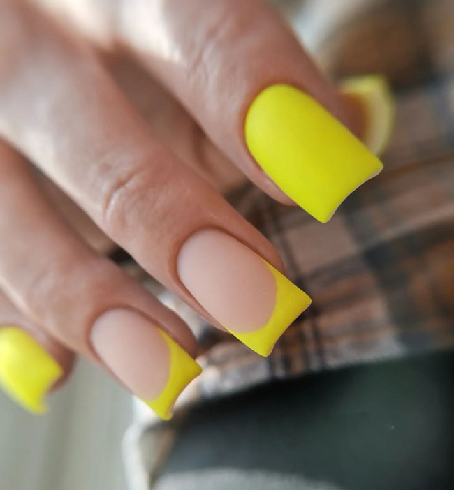 Френч – это классика, которая никогда не выйдет из моды. Такой дизайн всегда выглядит уместно и аккуратно, в любом стиле и образе, а потому его стоит рассматривать. При использовании цветного лака желтого оттенка можно будет произвести покрытие всей ногтевой пластины, после чего контрастным цветом нарисовать френч. Или же можно будет сразу произвести рисование дизайна при использовании оттенка желтого.