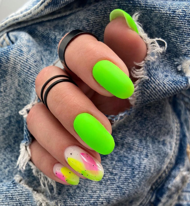 Популярно контрастное сочетание — молодежные яркие ногти, необычный красивый маникюр.