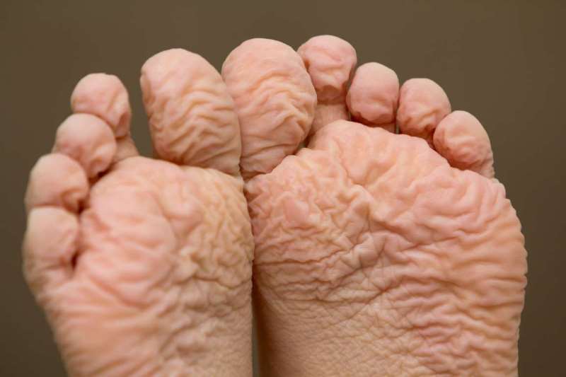 Непродолжительный контакт с водой (не больше часа), приведет к появлению незначительной мацерации кожи на пальцах. Чтобы процесс набухания клеток эпидермиса затронул ступни ног и ладони, должно пройти значительно больше времени – свыше 10 часов.