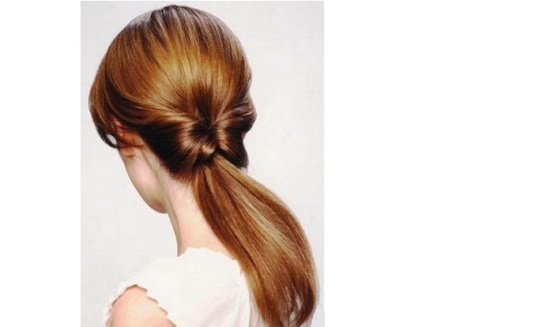 Сделайте тугой хвост сзади у основания головы. Желательно тонкой, не выделяющейся, резинкой. Разделите волосы над резинкой на две стороны, проденьте хвост в получившееся пространство при этом, слегка высвобождая волосы, из-под резинки. Эта причёска универсальна и проста. Её можно также дополнить нежными цветами у основания хвоста или красивой заколкой.