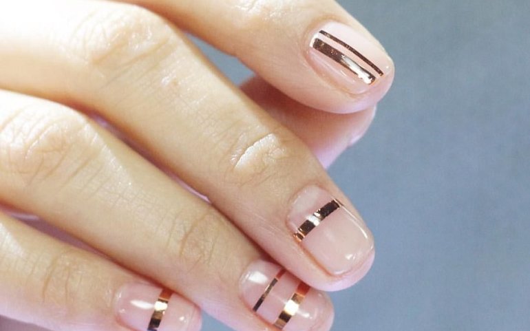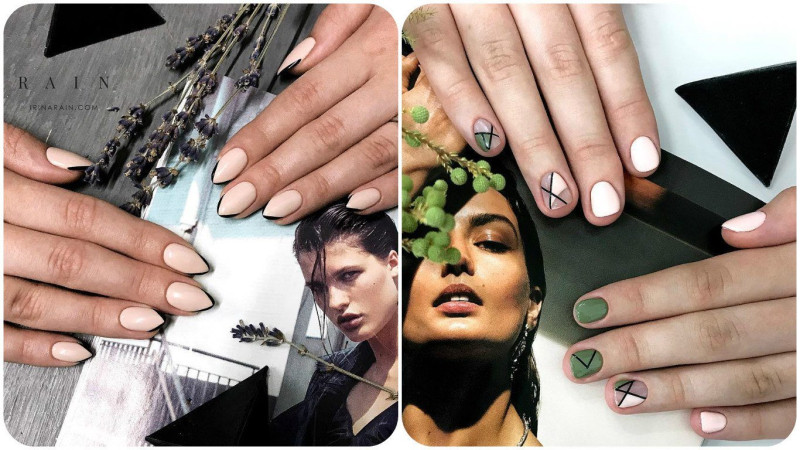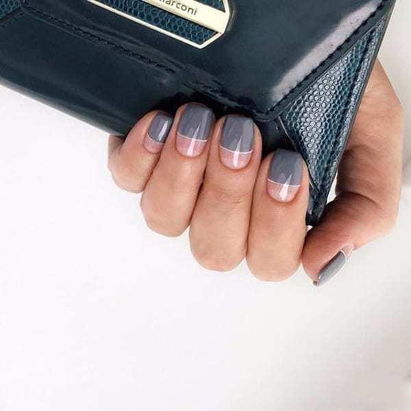 Здесь дизайн должен быть простым, но можно использовать покрытие всех цветов радуги. Не менее популярно сочетание прямых линий с кривыми и причудливыми изгибами. Экстравагантный маникюр получится в том случае, если ногтевую пластину по ее контуру обвести контрастным оттенком. Для обводки можно использовать яркий лак с эффектом металлик, а серединку сделать кремовой и сдержанной. Так можно удлинить ногтевую пластину визуально, а разница текстур сделает нейл-арт оригинальным. Не менее эффектно на коротких ногтях смотрится негатив спейс, мазки кистью, арт-минимализм, графические узоры.