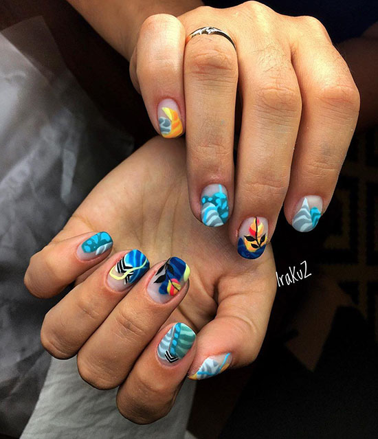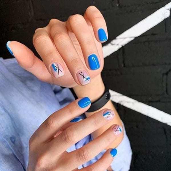 Вся смелость в одном дизайне – абстрактные рисунки, яркие акценты и все это на коротких ногтях.