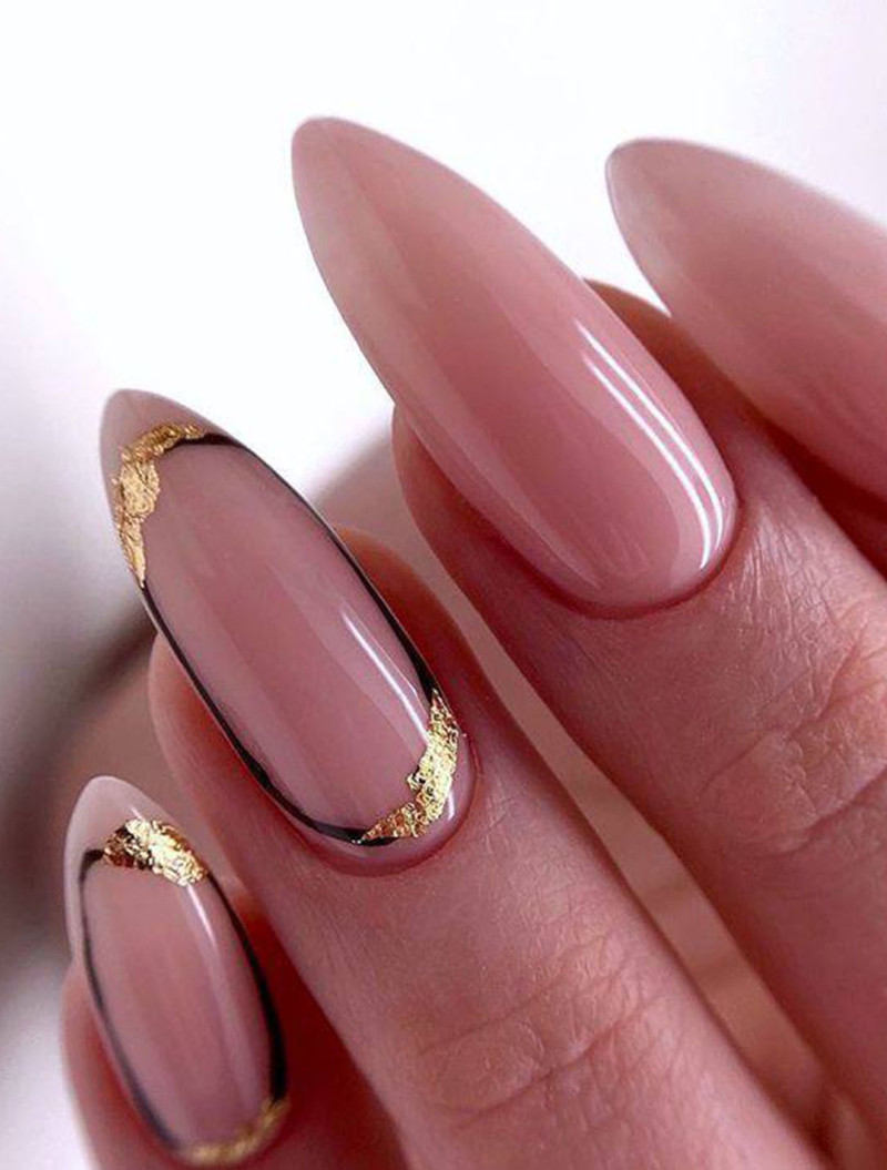 Маникюр с фольгой роскошен и элегантен. Особенно ярким и стильным решением станет применение золотой фольги, которая сразу станет модным акцентом образа. Можно наклеить фольгу хаотичными кусочками или заполнить часть ногтя. Не менее эффектно выглядит фольга вдоль линии кутикулы или по краю ногтя.