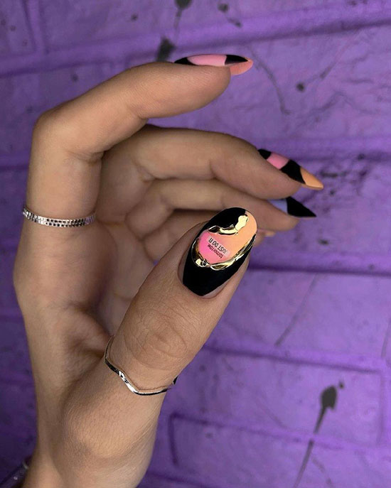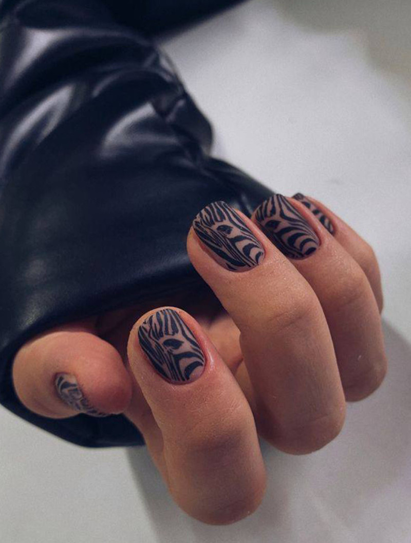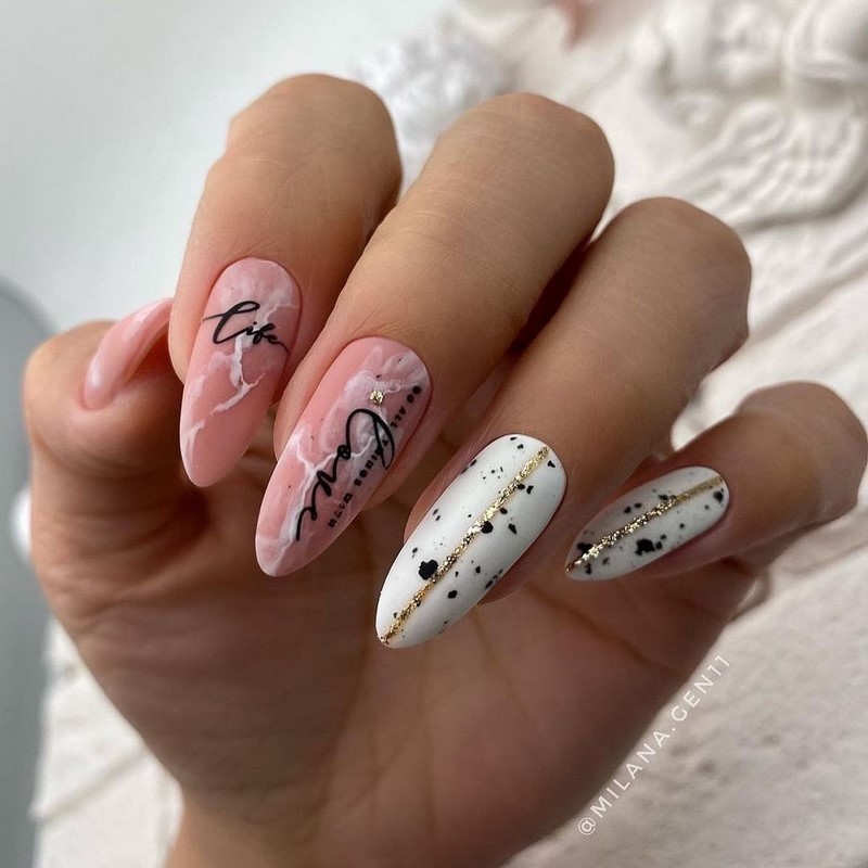 Маникюр с надписями черного цвета хорошо смотрится на матовом покрытии нюдовых оттенков. Такой дизайн можно дополнить мелким рисунком. Этот лаконичный дизайн украсит романтичный лук, повседневный или деловой.