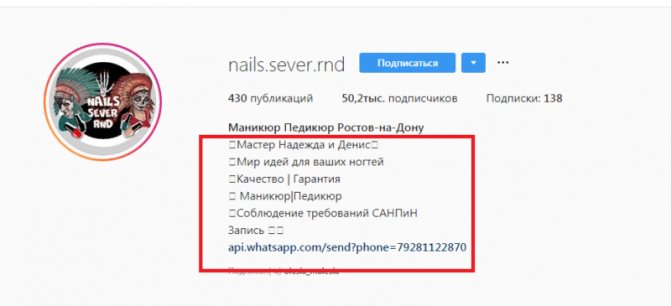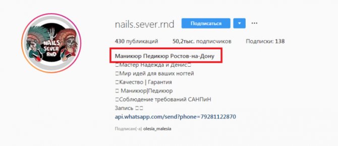 - Сразу под фотографией профиля указывается имя пользователя. Не используй эту графу для настоящего имени и фамилии. «Катя Краснова» ничего не даст, а вот «Маникюр педикюр Самара» поможет в поисковых запросах потенциальных клиентов.