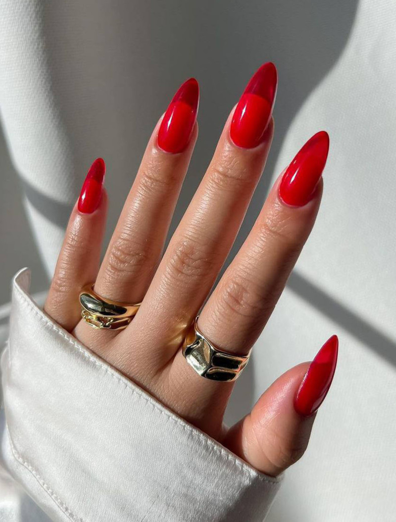 — Желейный французский маникюр. Необычный трендовый дизайн, который будет модным в 2023 – это желейный французский маникюр. Желейный френч выполняется в ярких оттенках (синий, оранжевый, красный, зелёный). В данном маникюре используется витражный лак, чтобы добиться полупрозрачности на ногтях, которая напоминает желе. Такой френч будет выглядеть нестандартно.