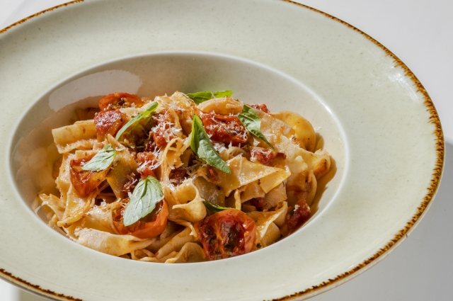 Шаг 9. Выложить пасту в глубокую тарелку. Хаотично украсить листьями базилика. Полить блюдо оливковым маслом и добавить тертый пармезан