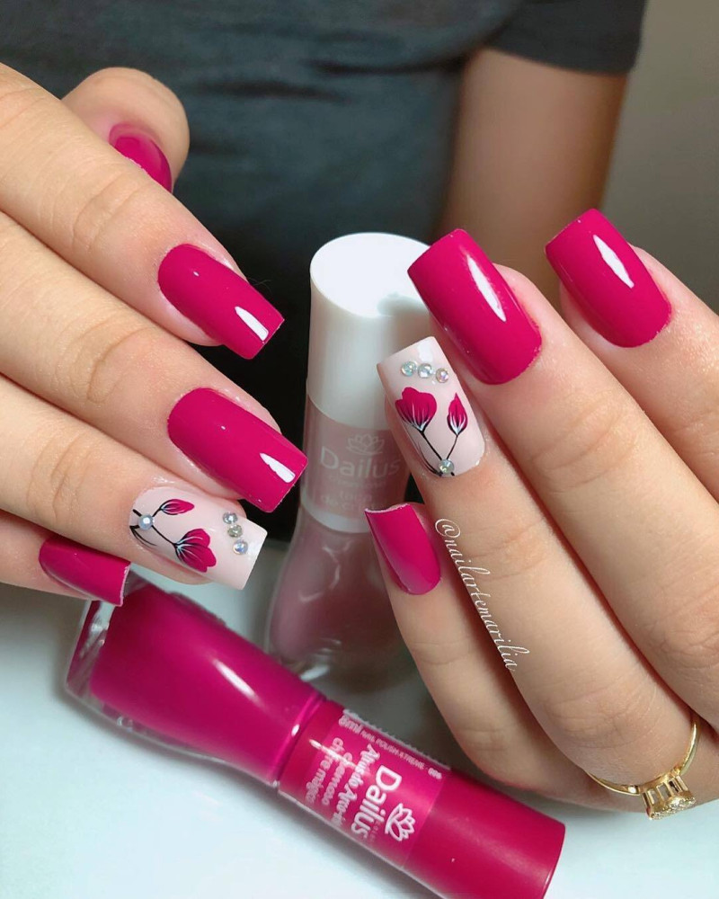 Если вы не приемлите экстравагантности и излишней вычурности, нанесите яркие цвета только на безымянные и средние пальцы, для остальных ноготков создайте спокойный, нежный дизайн в розовых, постельных или серых тонах.