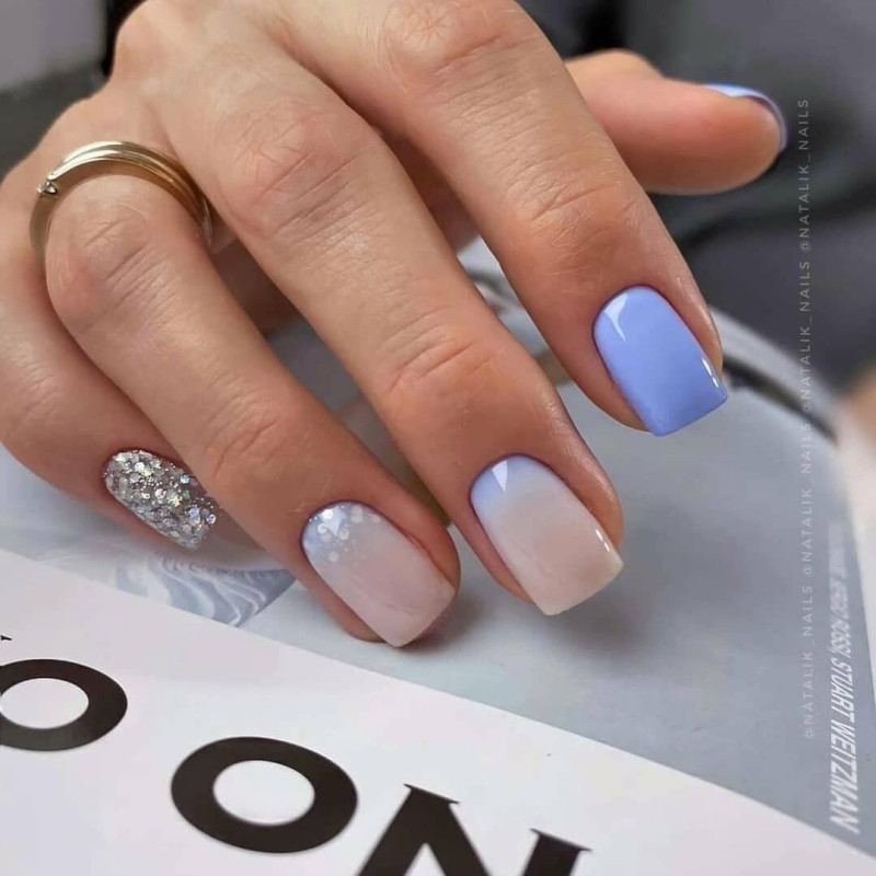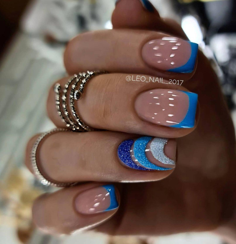 Техника омбре – образец романтики и тонкого вкуса, его можно обогатить битым стеклом, прозрачными бусинами, стразами, камнями или объемными миниатюрными фигурками. Покройте каждый новый пальчик лаком, на полутон светлее предыдущего. На невысохший слой на мизинчике потрусите насыщенно-синим глиттером. На указательных пускай красуется редкая ракушка с дорогой жемчужиной, или же сокровища, затерянные на дне океана.