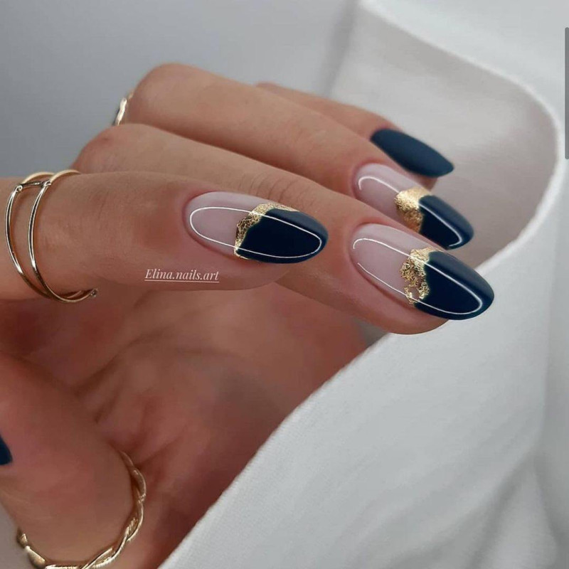 Для осеннего маникюра актуальны довольно темные оттенки синего — от индиго до сине-свинцового. Это самостоятельный оттенок, который можно дополнить контрастным цветом — оранжевым, желтым, золотом или серебром.