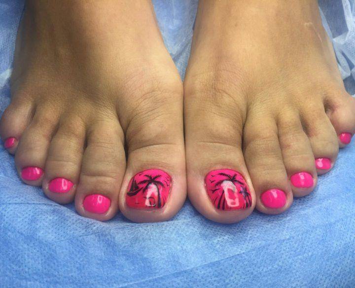 Для девушек, которые любят романтический стиль, по достоинству оценят педикюр в розово желтом стиле с рисунком пальм, на большом пальце. Также оригинально его дополнит несколько страз по нижнему краю рисунка.