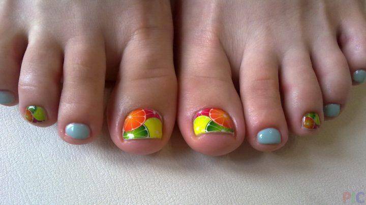 Интересным будет педикюр в голубом тоне, а на большом и третьем пальчике прорисованы кружочки лимона и апельсина, разных цветов.