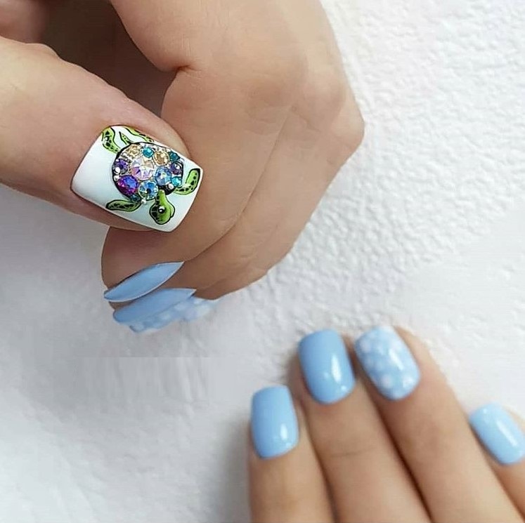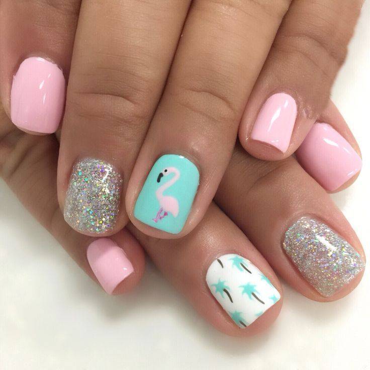Жемчужный, бледно-розовый, песочный, светло-голубой прекрасно подойдут к любому наряду. Нежный летний маникюр можно украсить красивыми картинками, наклейками, камушками, камифубуками, фольгой, жидкими и сухими блестками и многими другими украшениями. Нежные тона лака зрительно удлиняют короткие ногти.