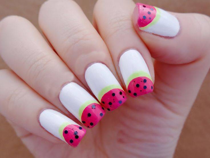 На длинных ногтях эффектно будет смотреться маникюр с фруктами, ягодами, модными тенденциями: экзотический авокадо, сочный арбуз, киви с имитацией капель воды непременно поднимут настроение. Девушкам, привыкшим к классическому френчу, рекомендуем сменить белую полоску на яркую цветную улыбку на кончиках ногтей. Такой маникюр этим летом точно будет в центре внимания.