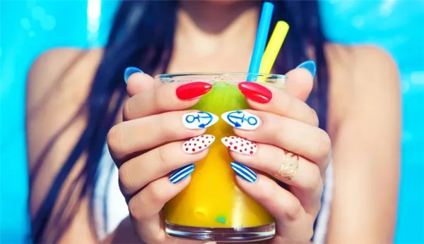 Если всех вышеперечисленных аксессуаров дома не нашлось, можно создать не менее потрясающий декор с помощью нескольких лаков ярких и сочных оттенков. В разгар сезона отпусков особенно актуален именно такой дизайн. Самыми популярными цветами являются все оттенки синего, голубого, красного, желтого, оранжевого и белого.
