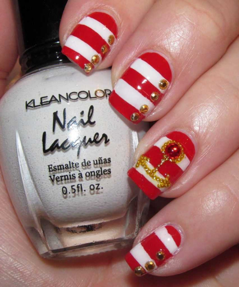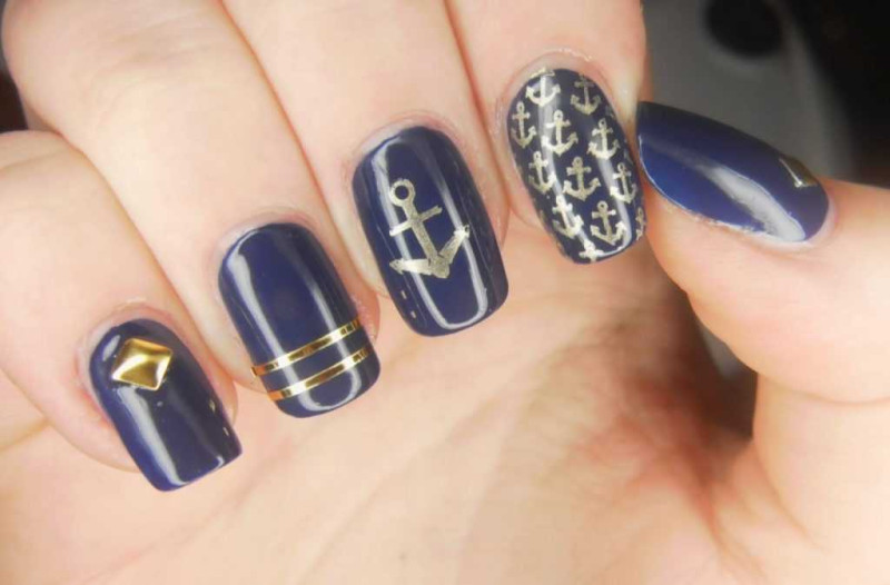 Неплохо якоря будут смотреться, если их нарисовать поверх горизонтальных полосок или даже дополнить им французский маникюр. Традиционно якоря рисуют синим или черным цветом. Но не менее эффектными они получаться, если их изобразить золотым или красным.