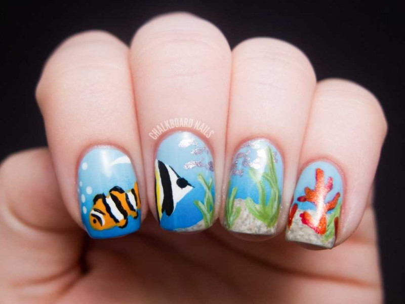 Настоящим произведением искусства ваши ноготки станут, если украсить их красивым рисунком или аппликацией обитателей морских глубин. Вам лишь нужно выбрать, кто это будет: черепашка, морская звезда, крабик, коралл или обычная ракушка.