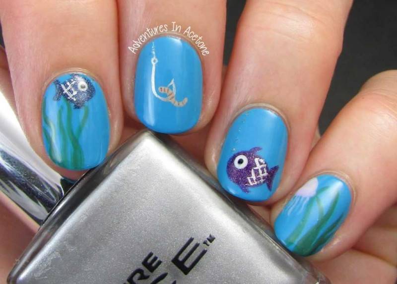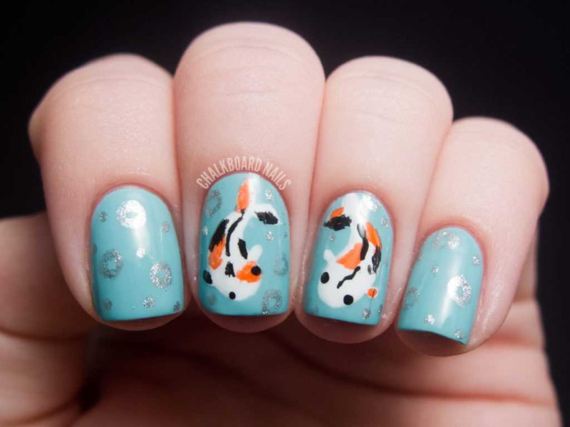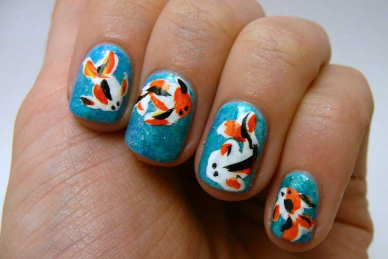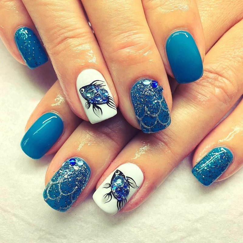 На один акцентный ноготок можно наклеить изображение золотой рыбки. Все остальные пальчики покрыть голубым или белоснежным лаком. Впечатляюще будет выглядеть дельфин или синий кит, нарисованные кистью.