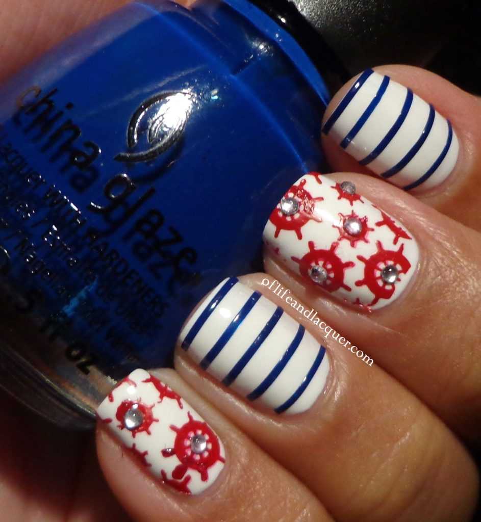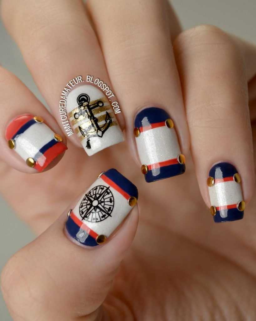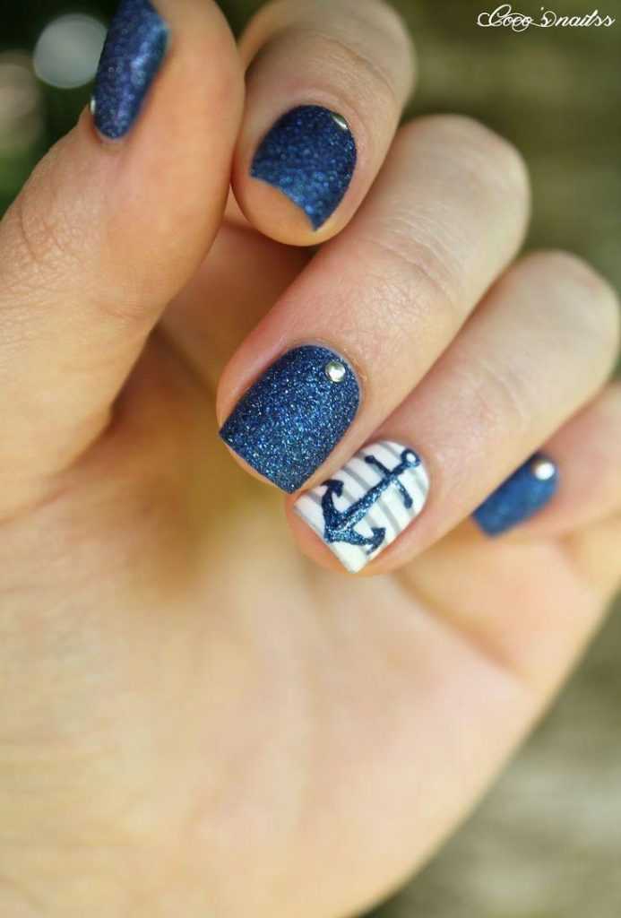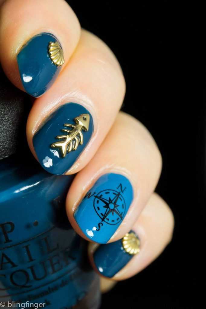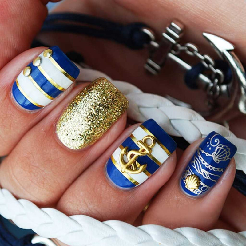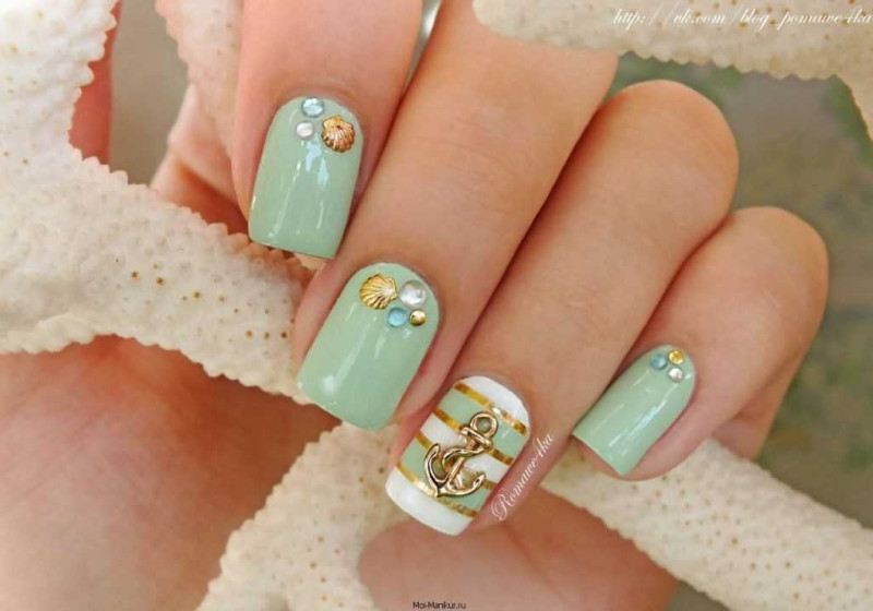 С чем у вас ассоциируется море? Многие, наверное, ответят с кораблями или морскими круизами. Поэтому маникюр в морской тематике можно разнообразить изображением якоря или корабельного штурвала. Если вы не уверены в том, что сможете их идеально нарисовать, то можете просто воспользоваться соответствующими наклейками. А те, кто не боится кропотливой работы, и вовсе могут выложить их изображения из мелких бусинок.