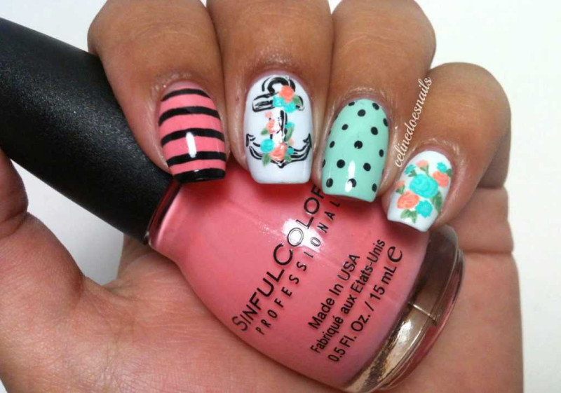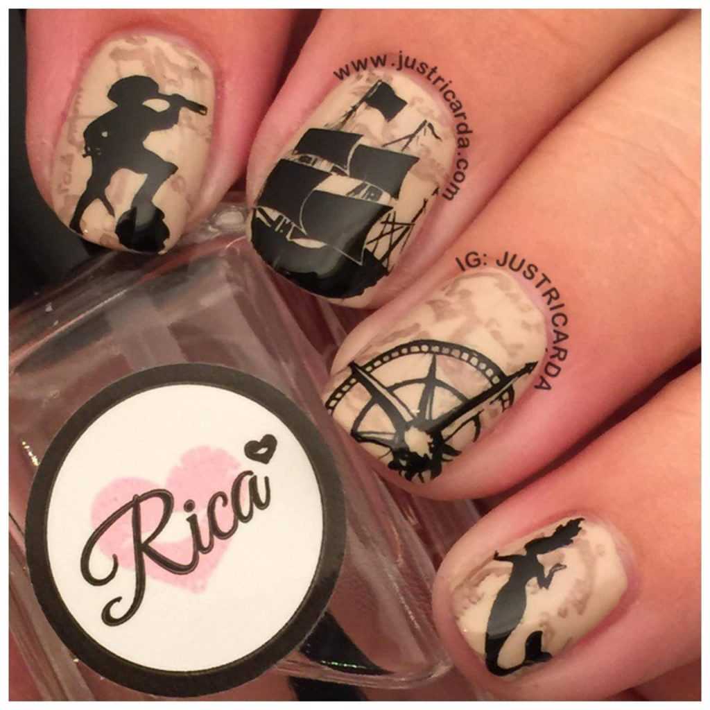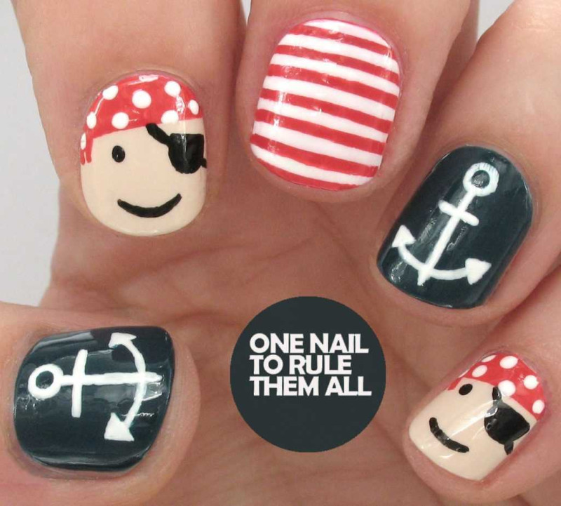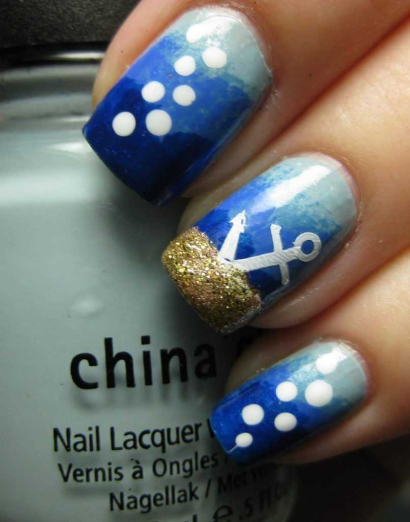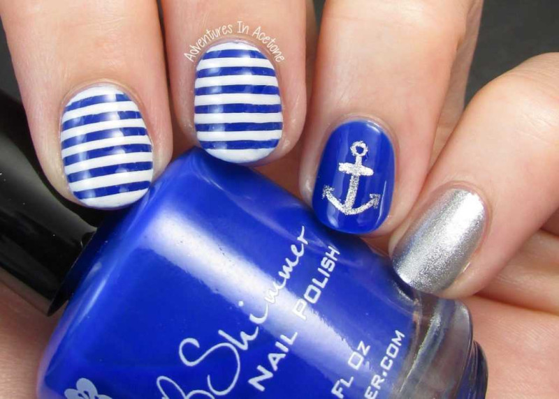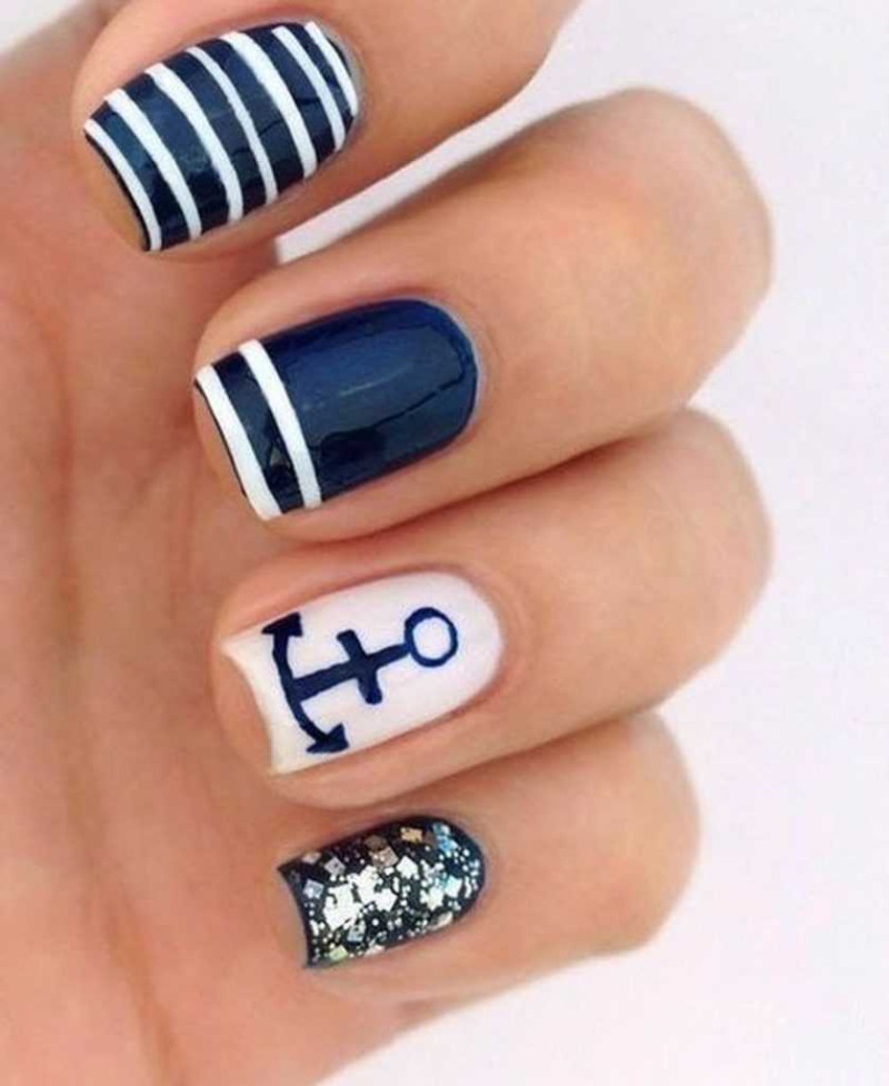 С чем у вас ассоциируется море? Многие, наверное, ответят с кораблями или морскими круизами. Поэтому маникюр в морской тематике можно разнообразить изображением якоря или корабельного штурвала. Если вы не уверены в том, что сможете их идеально нарисовать, то можете просто воспользоваться соответствующими наклейками. А те, кто не боится кропотливой работы, и вовсе могут выложить их изображения из мелких бусинок.