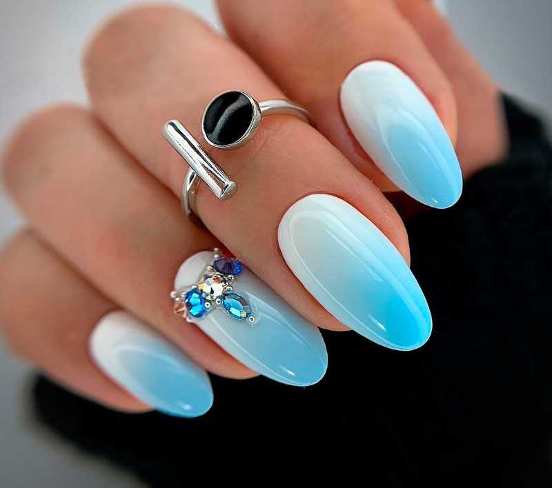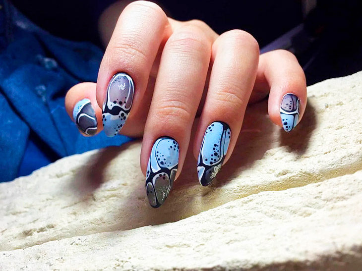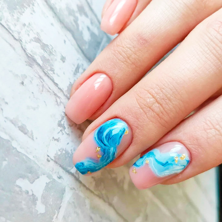 Еще одним вариантом столь неординарного подхода к маникюру является полупрозрачный волнистый дизайн с размытым эффектом и мраморными разводами. Сине-прозрачное омбре, голубое покрытие на нескольких ноготках с элементами декора – все эти варианты интересны любительницам смелых решений.