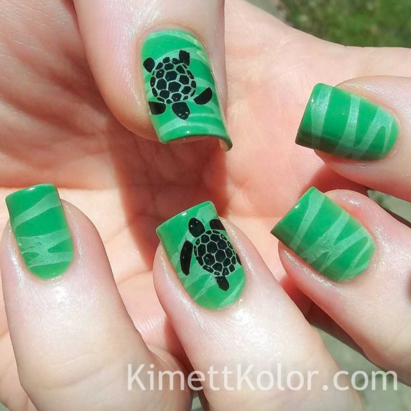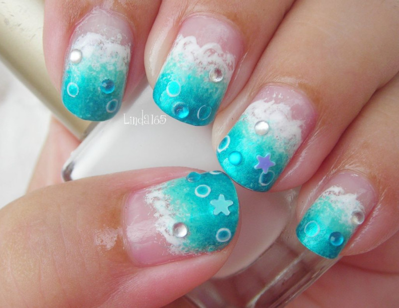 Комбинируя гель-лаки характерных водных оттенков (темно-синий+бирюзовый, темно-зеленый+голубой, прозрачный+светло-зеленый), можно создавать нежные цветовые переходы, в точности передающие изменчивость и красоту морских волн.