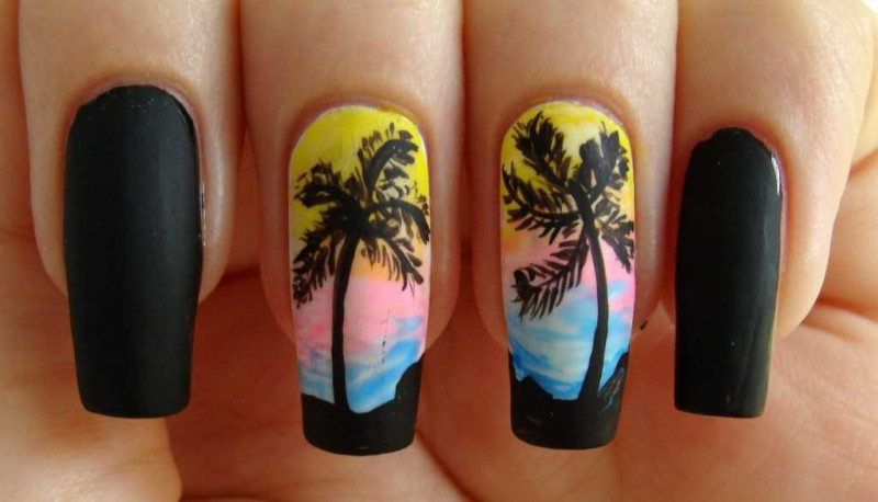 Пальмы — известный символ путешествий к морю — можно нарисовать на ноготках любой длины и формы, цвет фона — тоже любой! Важно лишь прорисовать силуэт дерева или листа лаком контрастного оттенка, чтобы придать росписи выразительность. Очень красиво смотрятся черные пальмы на бирюзовом, лимонном, ярко-розовом, лавандовом или белом фоне (как на фото). Понравившийся рисунок можно скопировать или просто взять за основу, чтобы разработать собственный уникальный маникюр с морской тематикой