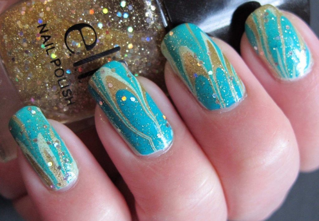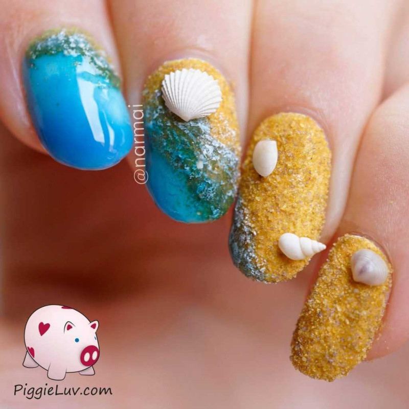 Не стоит забывать и о морском береге. Для этого используйте золотистый шиммер, который будет плавно переходить в бело-голубое покрытие. Таким образом, у вас получится эффект волны, которая накатывает на теплый песок. Как вариант, шиммером можно покрыть только один пальчик, в то время как все остальные выкрасить лаком голубого оттенка.