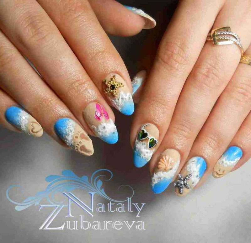 Для поездки на море, пляж, отдых ноготки украшают дизайнами с росписью, картинками, декоративными элементами в морском стиле. Это могут быть ракушки, бабочки, рыбки, морские звезды, имитация капель воды на ногтях. Сейчас актуально рисовать разводы в бело голубых тонах, напоминающие волны с пенкой на пляже. Также очень красиво смотрится натуральный ракушечник в дизайне маникюра. Дополненный акварельной вуалью он загадочно переливается разными оттенками.