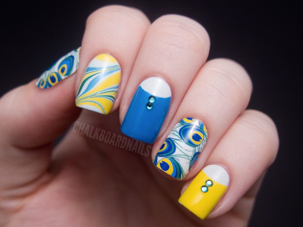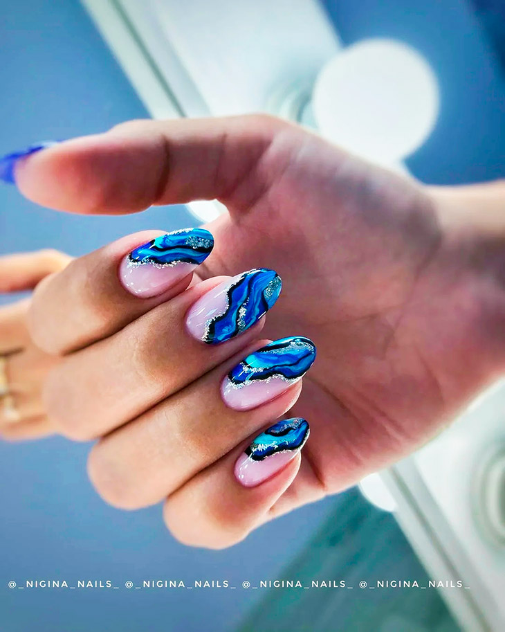 Разбитое стекло или размытые полосы белого и синего цветов могут помочь создать эффект воды. Нестандартным решением станет геометрический маникюр в оттенках синего или белого, дополненный скотчем.
