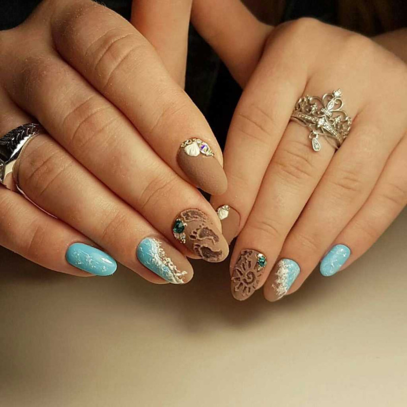 Самые модные новинки предполагают комбинированные техники исполнения и различные вставки из довольно необычных элементов, то есть разнообразить такой маникюр на море 2019 различными техниками будет очень кстати.
