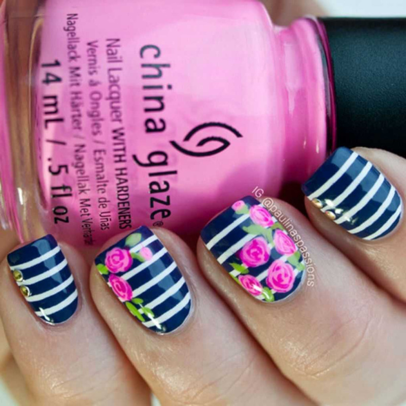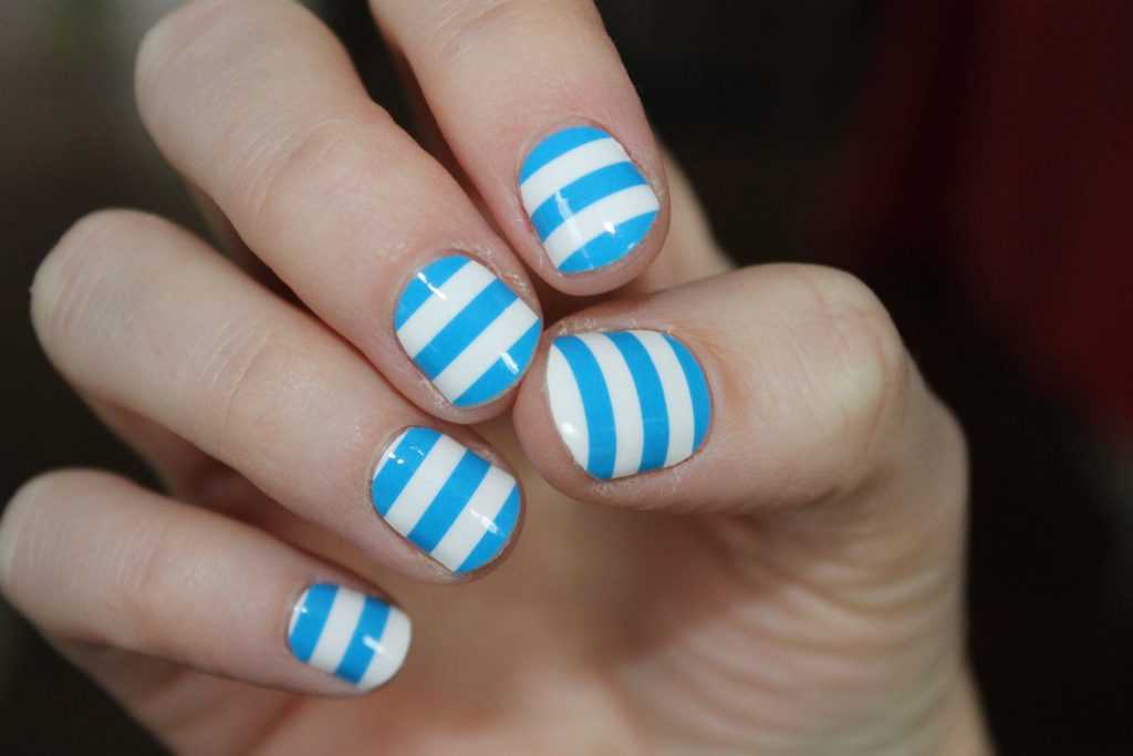 Образ морячки непременно привлечет к вам внимание окружающих. К тому же полосатый маникюр этим летом будет особенно популярным. А чтобы линии получились ровными и четкими можно воспользоваться скотчем или стемпингом