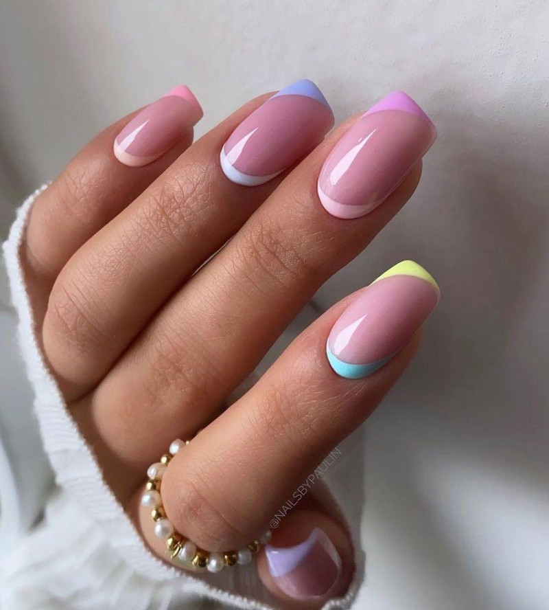 Оригинально смотрится и френч в такой вариации. А соединение нескольких разноцветных пастельных тонов будет очень эффектным. И конечно же не забываем про дизайн: втирка; слайдер, стемпинг. Фантазируем и создаем красивые волны нежного разноцветного маникюра.