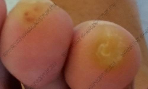 Корневая мозоль – имеет округлую форму, выступает над кожей, чаще всего имеет желтоватый оттенок. Посередине новообразования имеется темная точка, которая является верхушкой ее корня. Мозоль образуется из-за ношения тесной обуви и чаще всего появляется на пальцах ног, особенно на мизинцах.