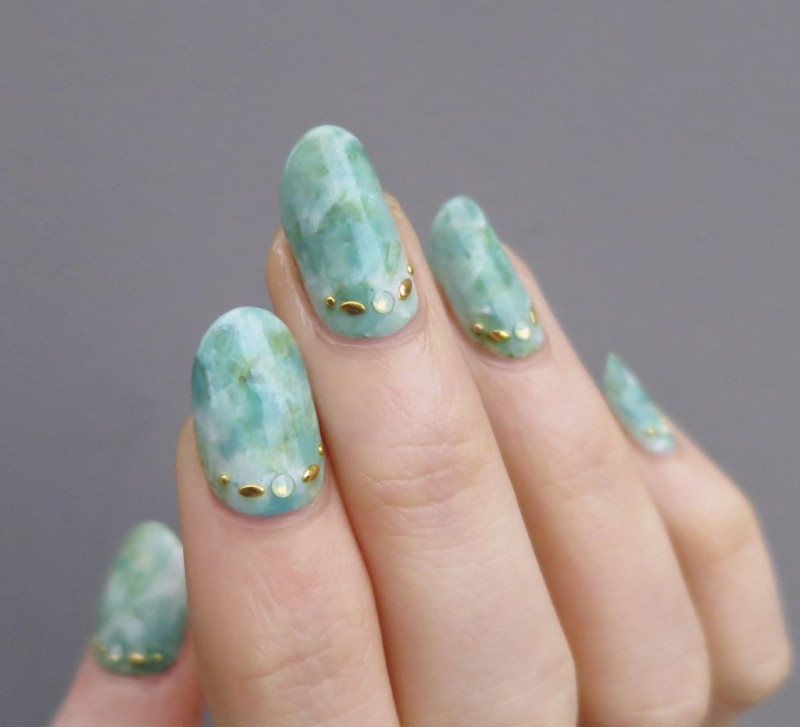 Широкое применение получили и светло-зеленые, изумрудные тона, поскольку они считаются самыми сочными и яркими оттенками цветовой гаммы. Помимо этого, используя для рисунка лаки «металлик», можно получить необычные изображения с 3D эффектом камня.