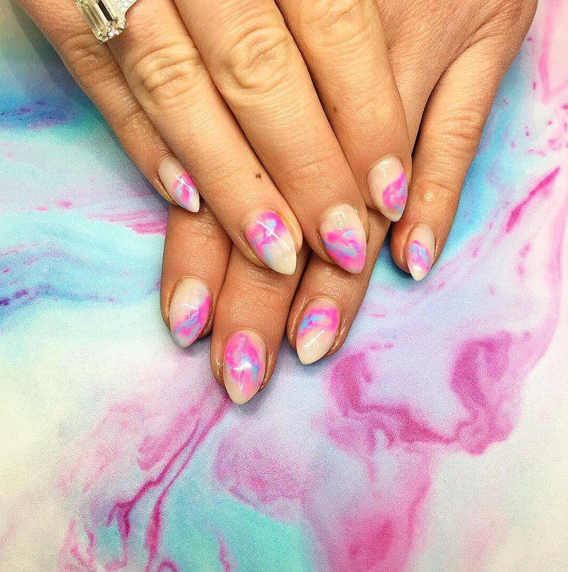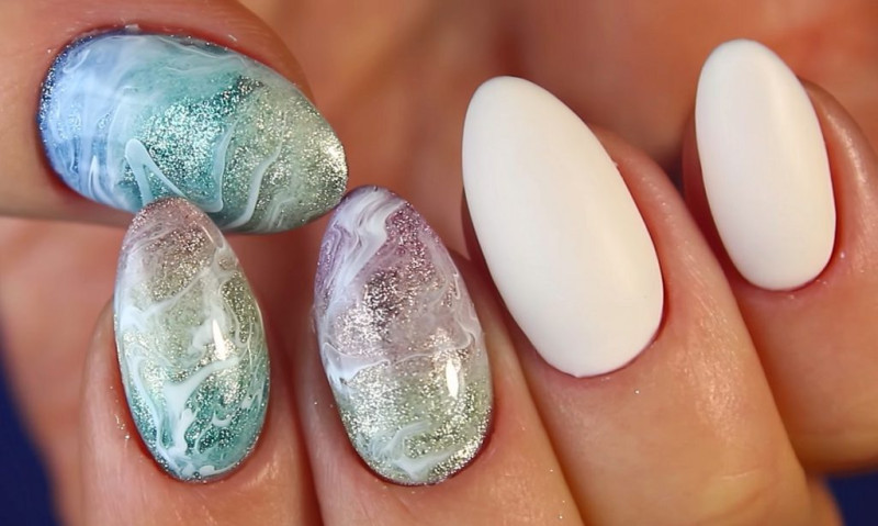 Пример мраморного маникюра: YouTube/Amy Lee Beauty Также для основы используют и более нестандартные цвета: синий, зеленый, красный.