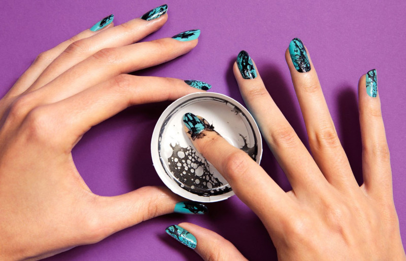 Для этой техники создания мраморного маникюра используйте воду. В стаканчик с холодной водой налейте несколько оттенков лаков, которые образуют на поверхности воды пленку. С помощью зубочистки сделайте произвольные разводы и обмакните каждый ноготок таким образом, чтобы пленка из лака приклеилась к ногтевой пластине. Лак с кожи вокруг ногтя уберите с помощью средства для снятия лака и ватной палочки.