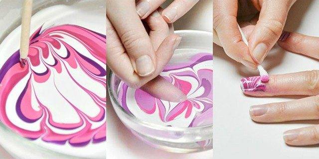 - Доступность материалов. Для такого маникюра не нужно покупать дорогостоящий декор. Нужны только лаки. Кстати, для водного маникюра советуют приобретать не очень дорогие основы, так как они медленнее сохнут.