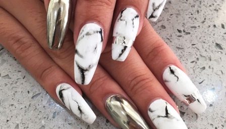 На длинных ногтях мраморный рисунок будет смотреться как нельзя актуально. Популярно его сочетать его с лунной техникой. Так, разводы мрамора наносятся на весь ноготок, а вот лунка у корня ногтя не закрашивают. Такой вид маникюра повседневный и элегантный, его также можно дополнять дизайном: рисунками, геометрией, стразами и бусинками.