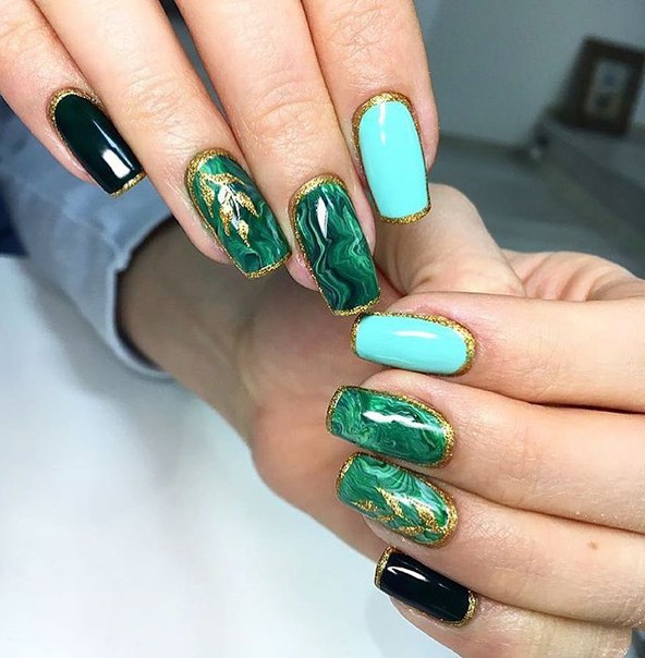 Не исключено и выполнение данного дизайна яркими цветами, такими как изумрудный, синий, бордовый, оливковый. Таким образом, легко добиться сходства ногтей не только с мрамором, но и с другими камнями, в том числе с бирюзой.