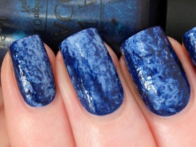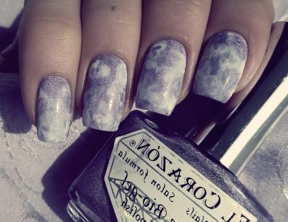 Еще один интересный способ создания мраморного эффекта заключается в том, что на ногти наносят сначала темный слой лака и дают ему просохнуть, затем наносят светлый слой лака. Скотч нужно смять и прижать его к еще непросохшему до конца ноготку. Часть верхнего слоя лака останется на скотче, а часть на ногте, имитируя естественные разводы.