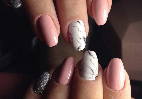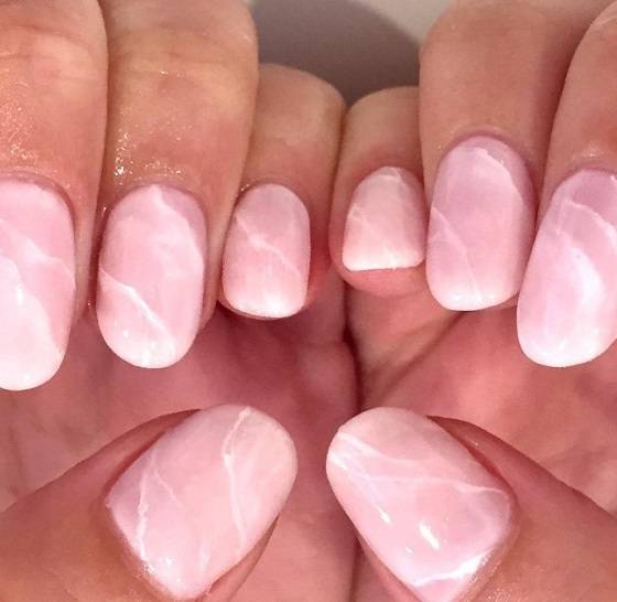 Красивый вариант мраморного маникюра – добавить базу-камуфляж, которая украсится рисунком мрамора. Фото-новинки такого маникюра представлены в различных вариациях.