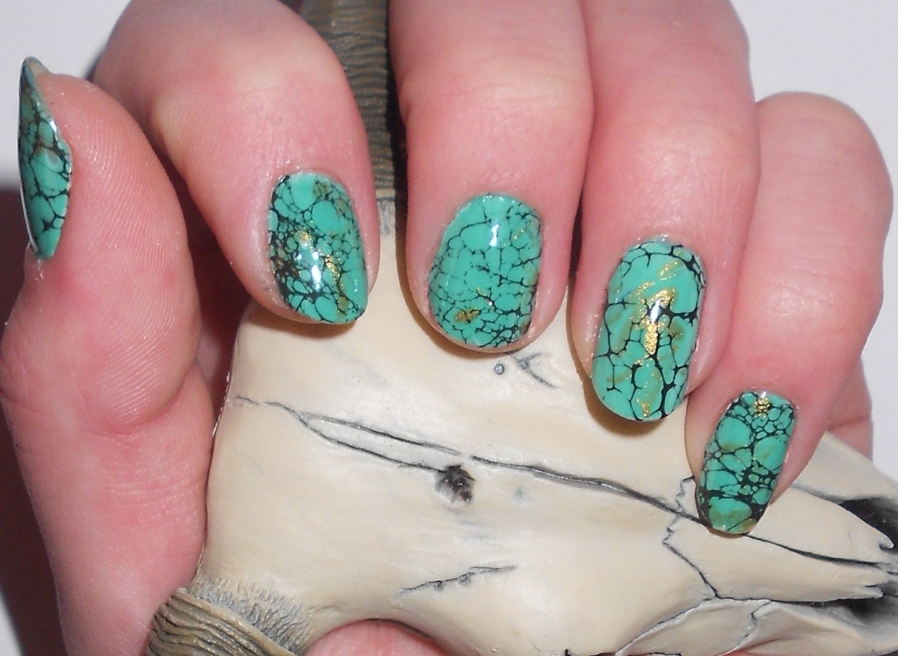 С помощью воды можно получить интересную каменную структуру, причем очень простую и легкую в исполнении. Рассмотрим, как сделать мраморный маникюр в стиле бирюзы, используя эту технику. Нам понадобится: емкость с водой, зубочистка, три цвета лака (черный, золотой и бирюзовый оттенки) и финиш. Лак быстро сохнет, поэтому откройте флаконы заранее и действуйте быстро. Итак, приступим:
